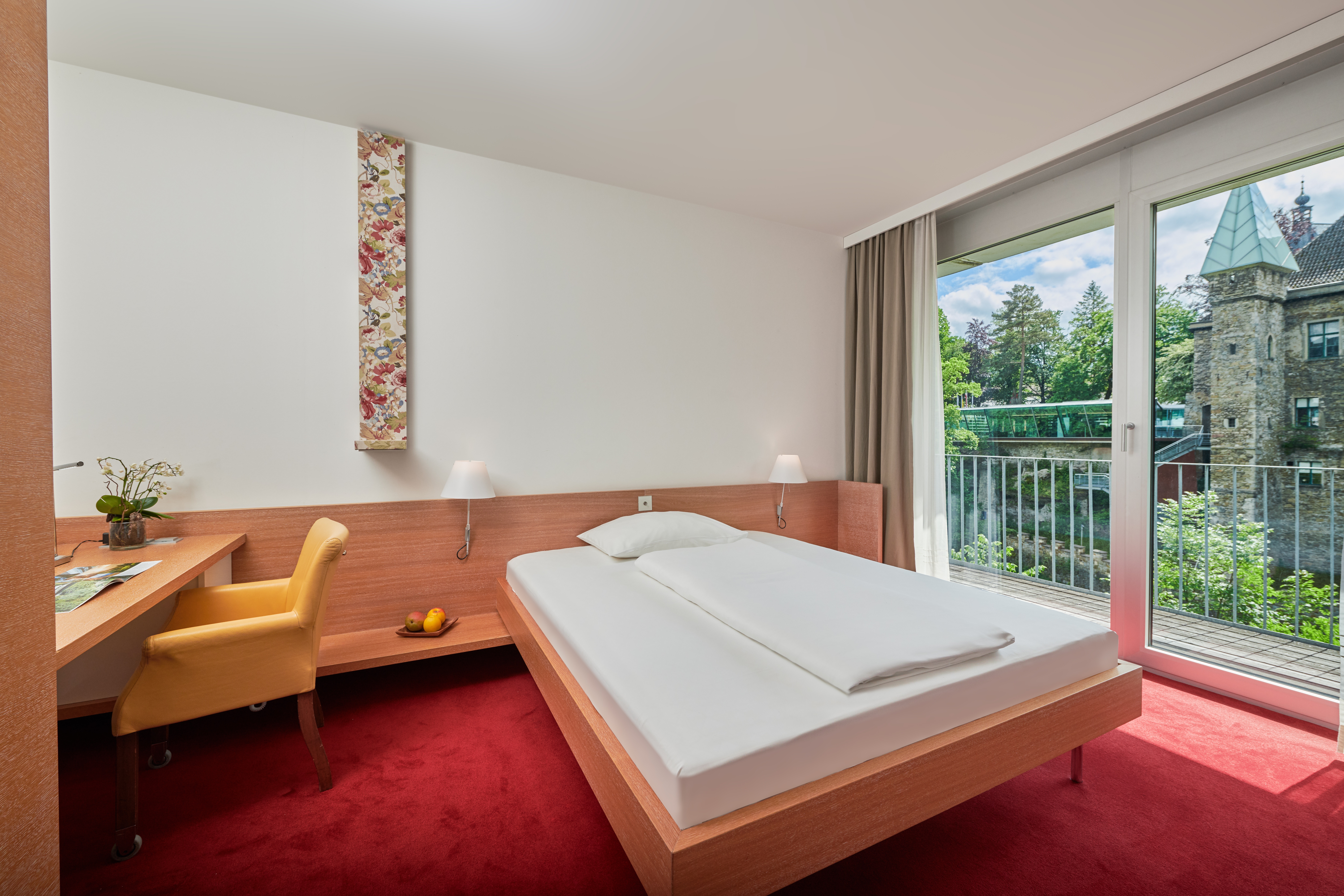 Zimmer in Waidhofen an der Ybbs mit Ausblick auf die kristallklare Ybbs und das mittelalterliche Rothschildschloss. Entlang des Felsens zur Ybbs thronen moderne Ybbszimmer mit geradlinigem Interieur.